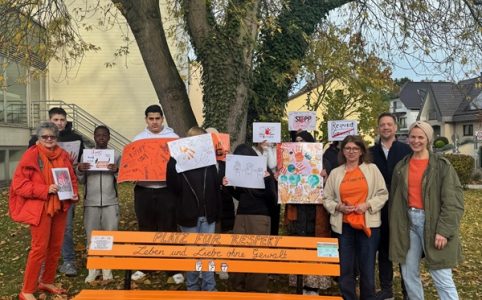 Schülerinnen und Schüler der Hans-Dietrich-Genscher-Schule gestalten „Orange Bank“ vor dem Rathaus In Kooperation zwischen der Gemeinde, der Gleichstellungsbeau...