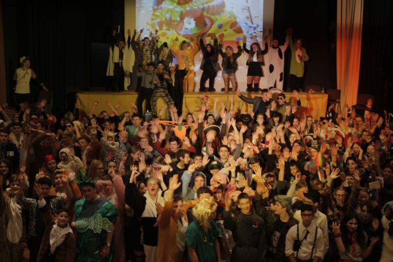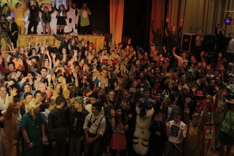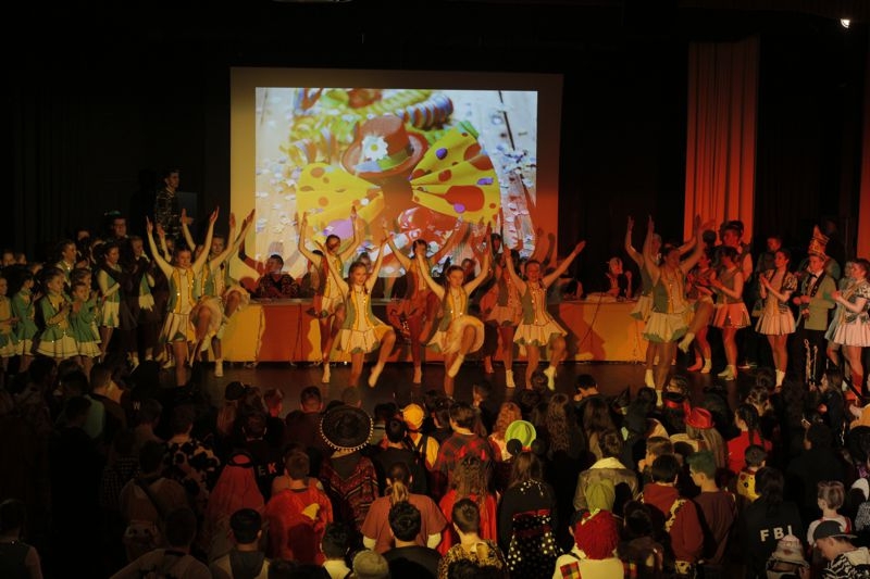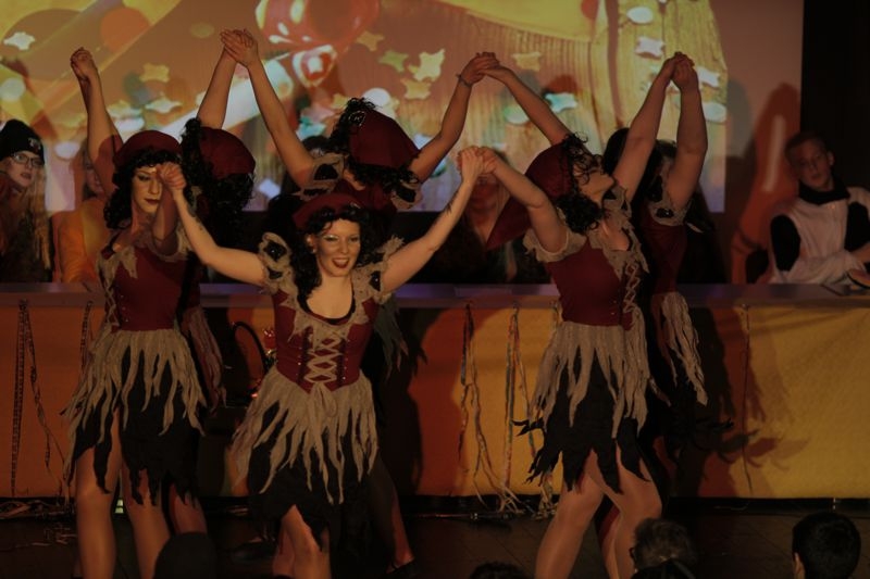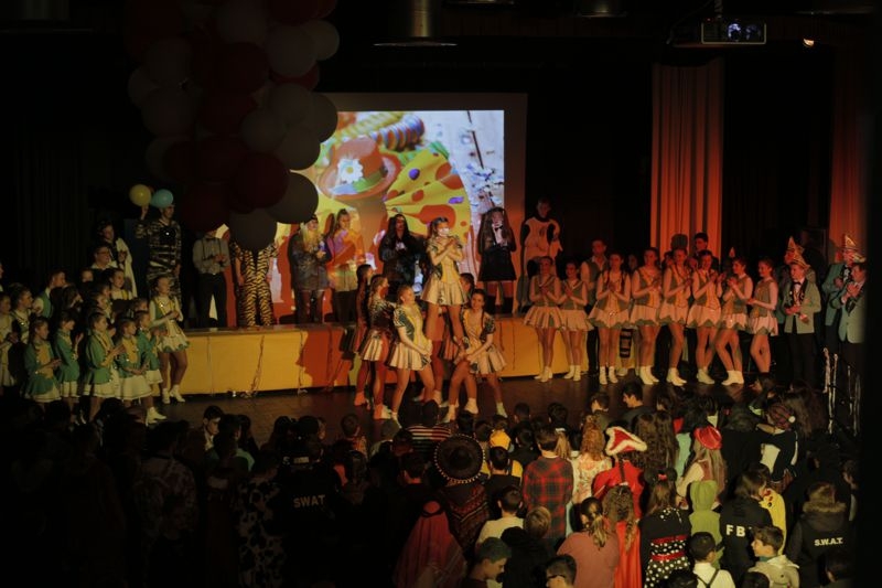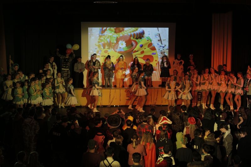 An Weiberfastnacht ging es morgens rund in der Hans-Dietrich-Genscher-Schule, denn Schulpflicht bestand zwar für Schüler und Lehrer gleichermaßen, aber Mäppchen, Taschenrechner und Collegeblock blieben zu Hause: Kostüme waren an diesem Tag Pflicht, und in der toll dekorierten Aula herrschte ausgelassene Partystimmung. Der Schüler-Elferrat hatte auf der Bühne Platz genommen, und die beiden Schülersprecher Phillip Schweiß und Kai Riegel moderierten schwungvoll durch den Vormittag. Einige Klassen hatten lustige Programmpunkte beigesteuert, u.a. gab es einen Kostümwettbewerb und einen Sängerwettstreit zwischen Schülern und Lehrern, der natürlich souverän von den Schülern gewonnen wurde. Begeistert aufgenommen wurde eine Balletteinlage der Stufe 10 zur Musik aus „Schwanensee“ als Dauer-Klassiker. Aber es kamen auch tolle Tanzgruppen von außerhalb in die Schule, die mit perfekt einstudierten z.T. fast akrobatischen Tänzen die Jecken in Erstaunen versetzten. So die Tänzer der Allgemeinen Karnevalsgesellschaft Prinzengarde Bad Godesberg und aus Wachtberg die Tanzcorps der KG Hetzbröde Adendorf und der KG Grün-Gelb Fritzdorf.