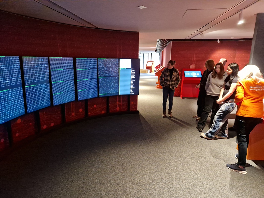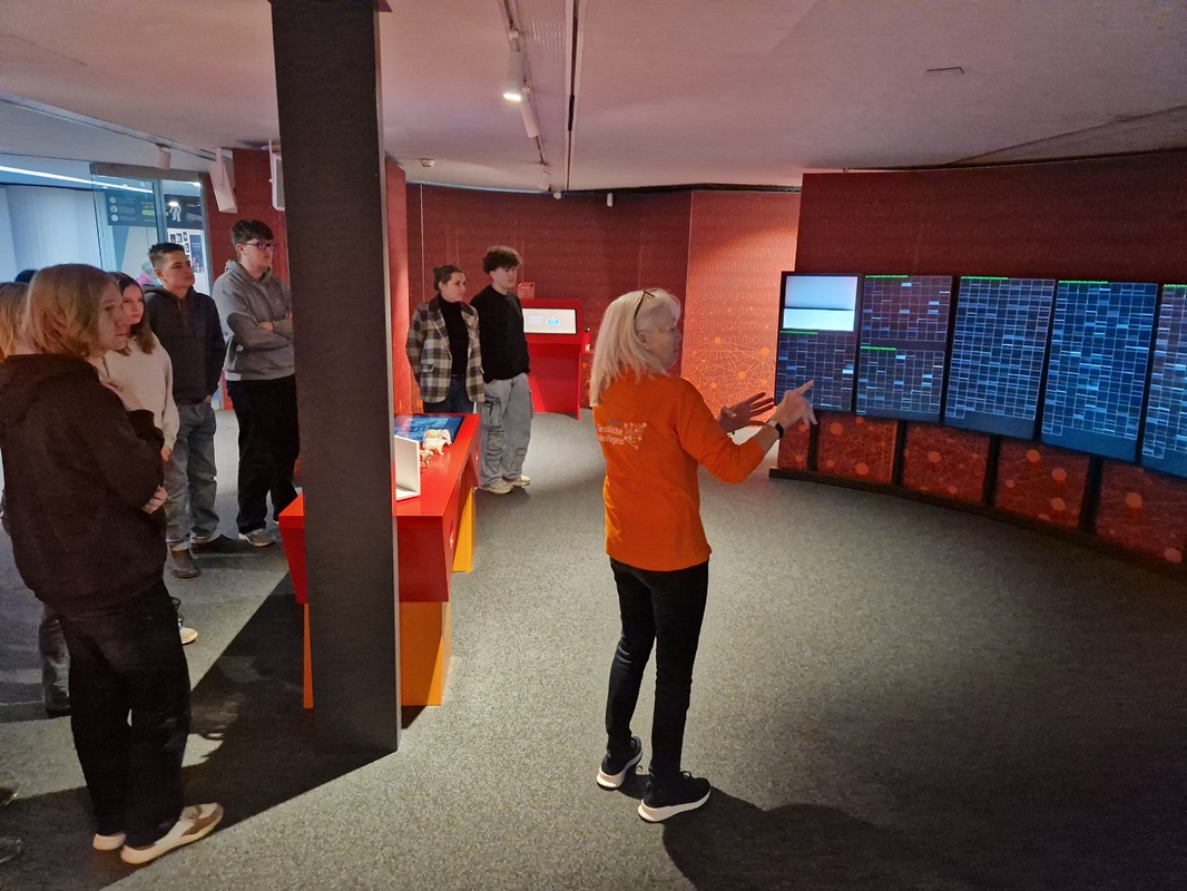 Nach einer kurzen Begrüßung im Museum erhielten die Schülerinnen und Schüler eine Einführung in die aktuelle Ausstellung zur Künstlichen Intelligenz. Dabei wurde deutlich, dass KI längst Teil unseres Alltags ist: von Sprachassistenten über Bilderkennung bis hin zu autonomen Fahrzeugen.