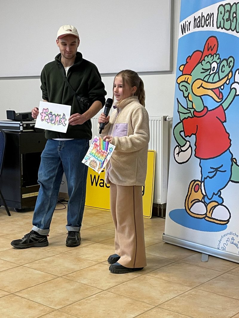 Auch künstlerisch wurde das Thema aufgegriffen: In einem Graffiti-Workshop mit dem Künstler Niklas Büchel entstanden in Kooperation mit der Hausaufgabenbetreuung unter der Leitung von Monika Flaspöhler farbenfrohe Arbeiten zu Kinderrechten. Während der Veranstaltung trat der Künstler gemeinsam mit der Schülerin Fiona nach vorne und machte deutlich, wie Kunst dazu beitragen kann, eine Botschaft sichtbar zu machen und gehört zu werden.