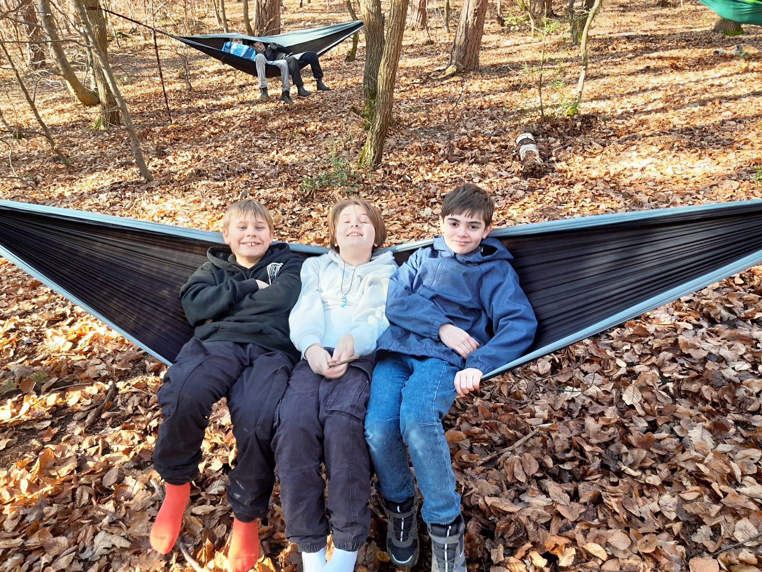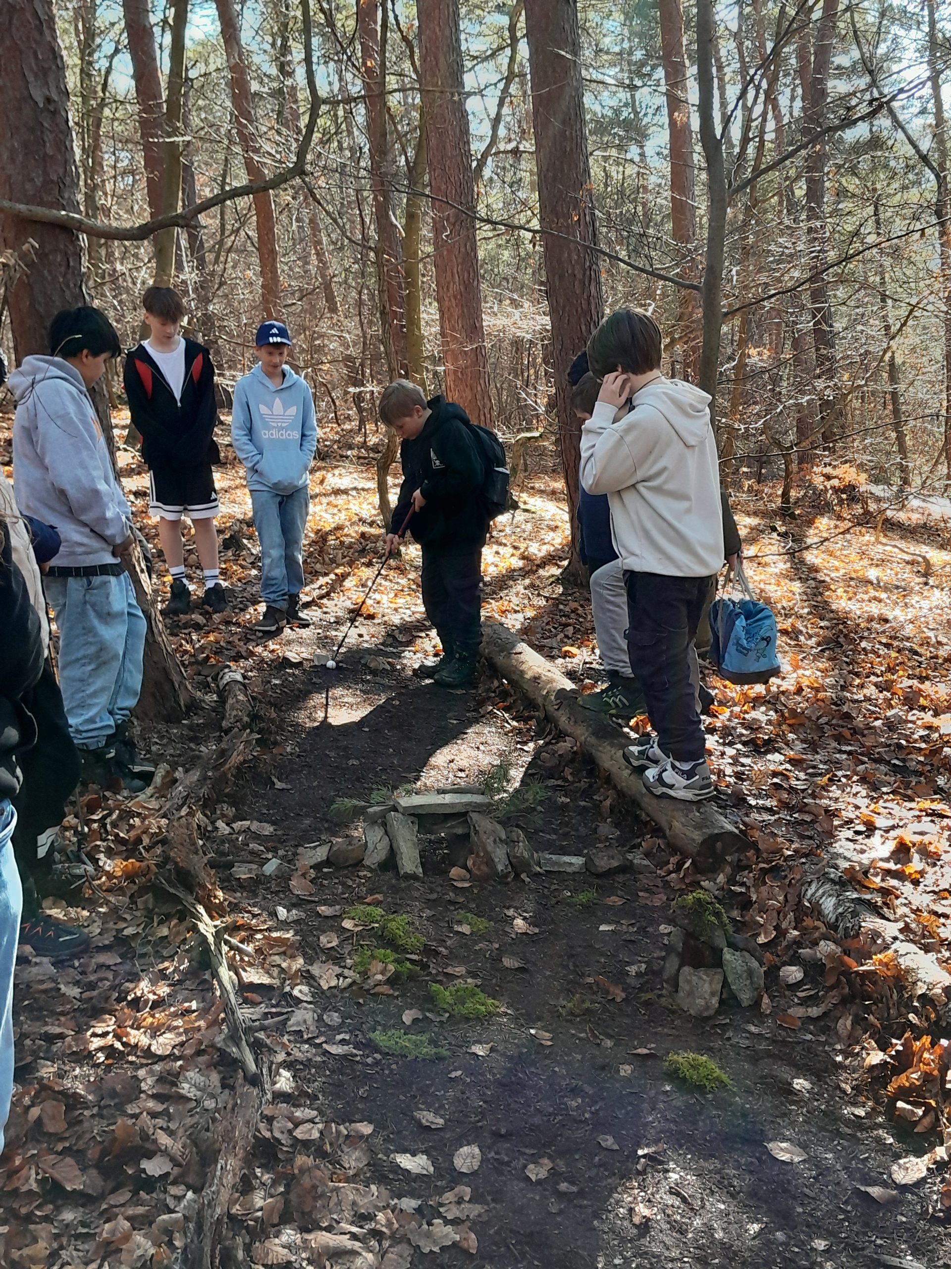 Nach dem Frühstück ging es bei strahlendem Sonnenschein durch die Weinberge in den Wald. Eigentlich wollten wir einen Ninja-Wald-Parcours machen, aber weil der Boden noch zu matschig war, mussten wir umplanen. Stattdessen bauten wir eigene Mini-Golf-Bahnen aus Steinen, Moos, Holz… Dabei sind tolle und sehr unterschiedliche Bahnen entstanden. Danach durften wir in Hängematten im Wald entspannen!
